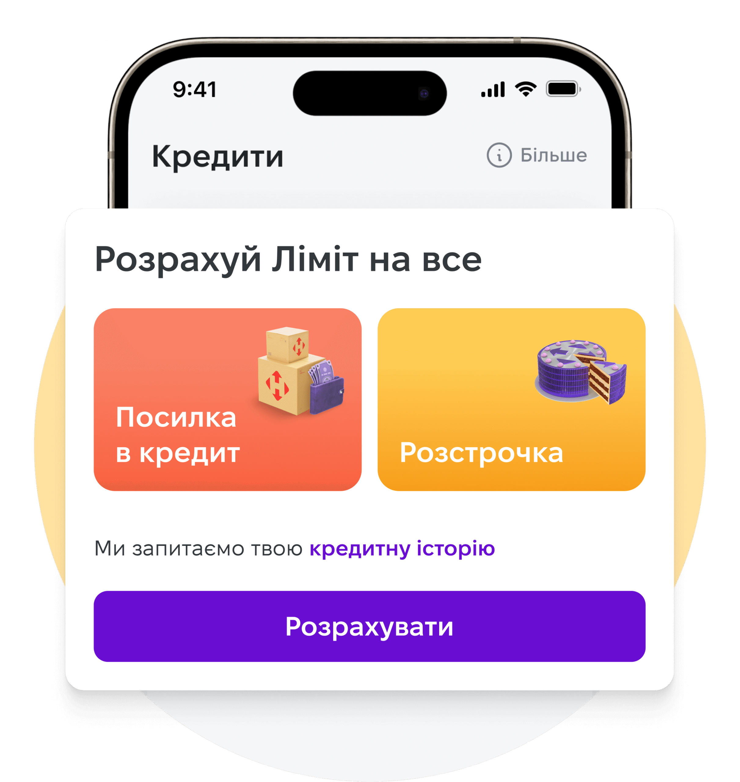👉 Click on the "Loans" menu at the bottom of the screen. Then click on "Calculate limit" to find out your maximum amount - it is determined by your personal credit limit. The minimum installment amount is UAH 500.
