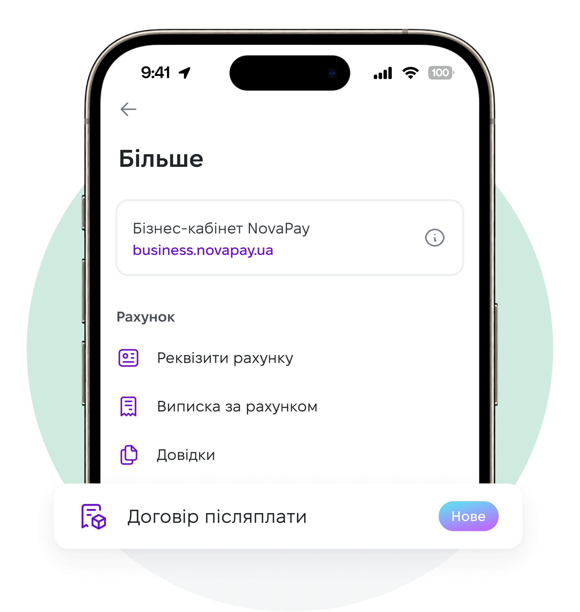 Якщо маєш рахунок ФОП у NovaPay, то в додатку тисни меню «Більше» → «Договір післяплати» → «Оформити договір». Ми перевіримо твої документи, і все, що тобі залишиться, – підписати договір. Якщо маєш рахунок ФОП у банку або представляєш юридичну особу, звернися до онлайн-підтрики, щоб дізнатися більше.